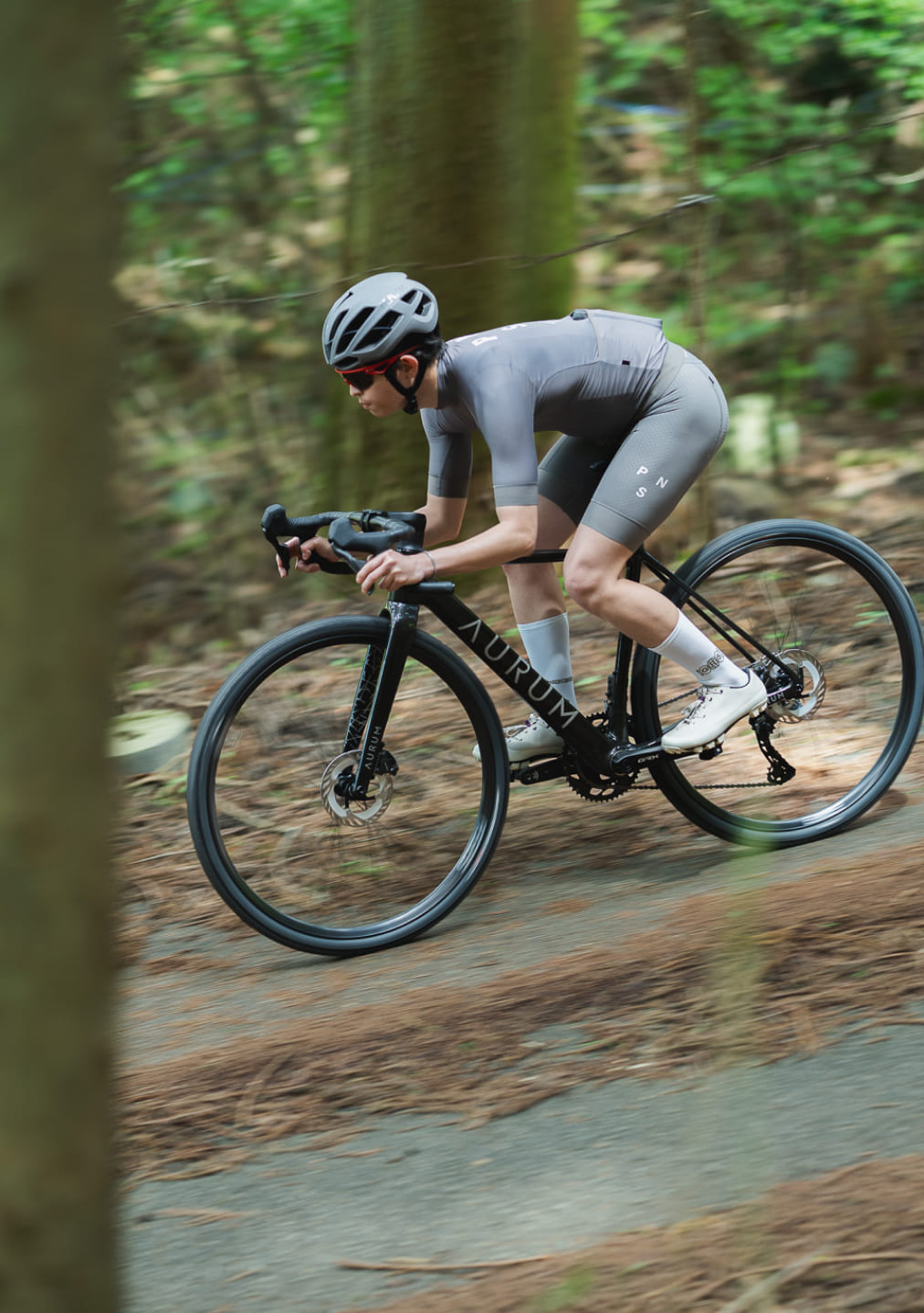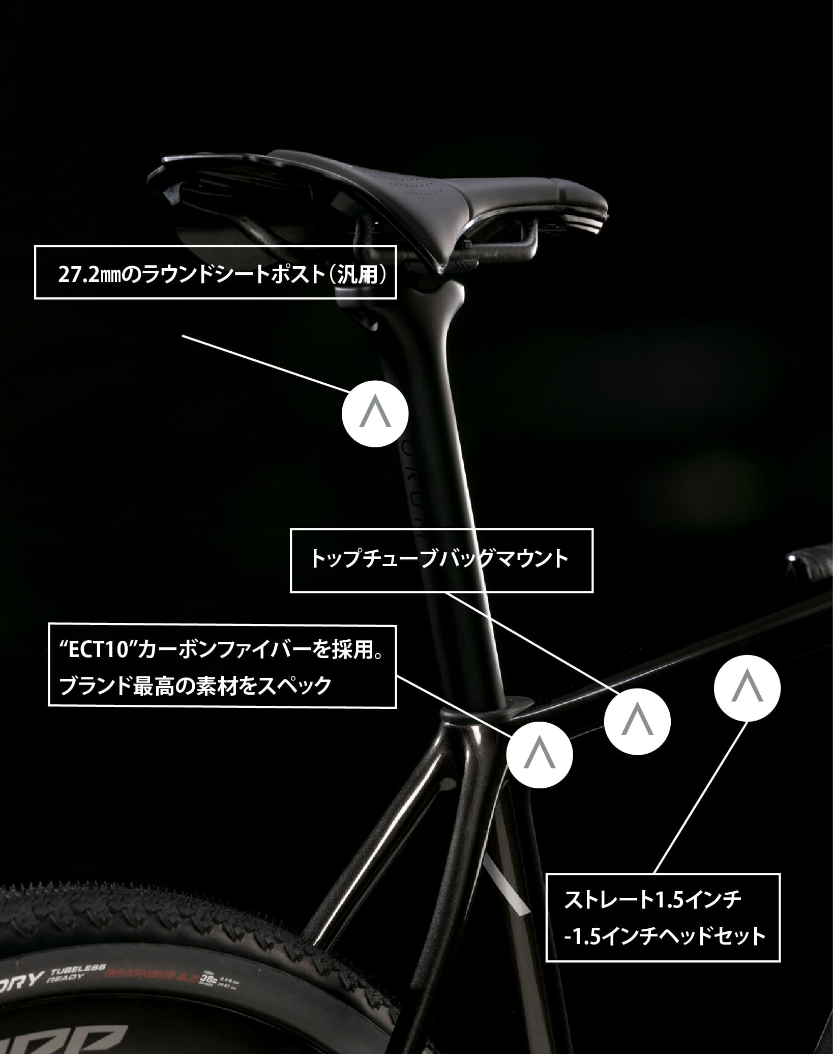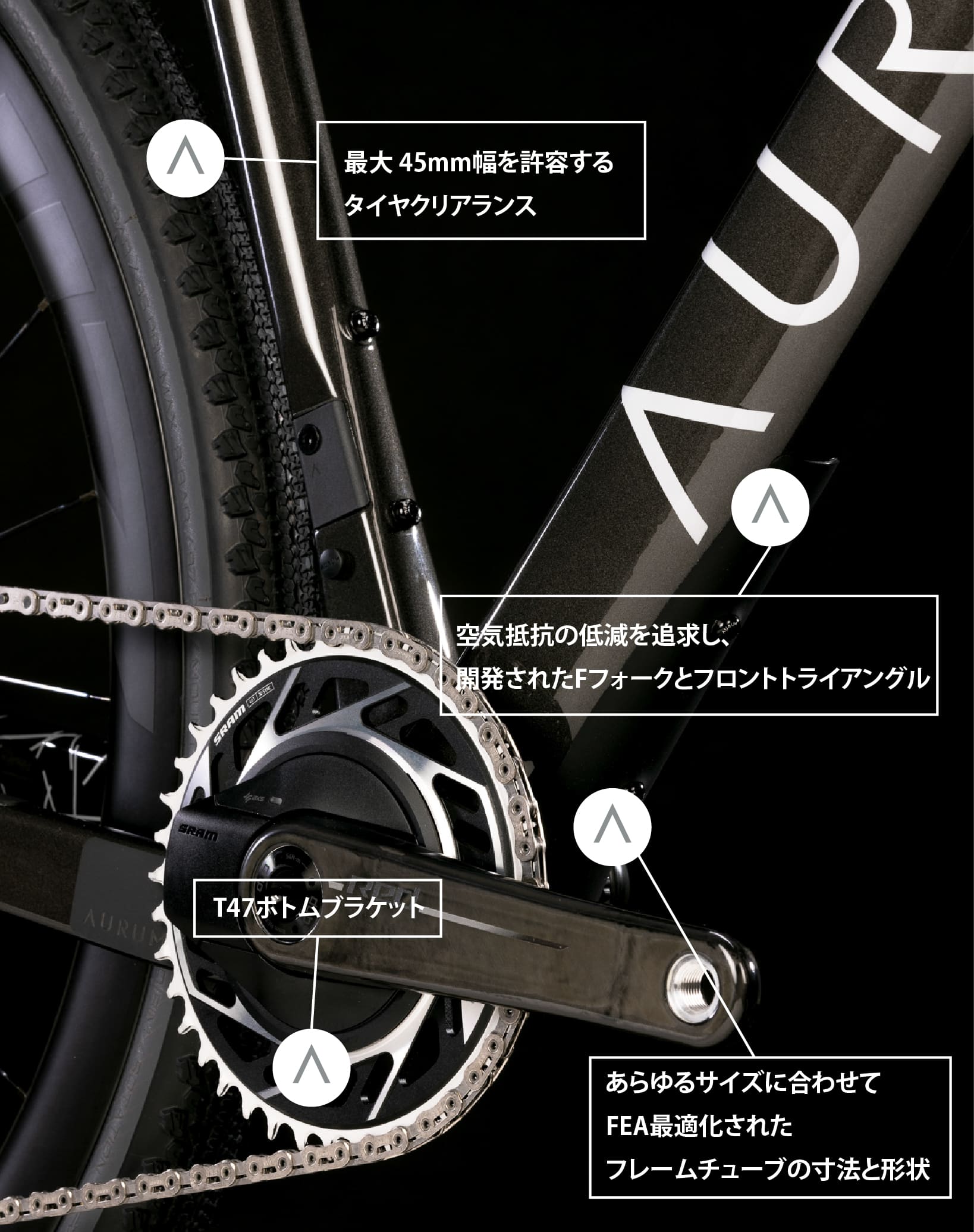タフネスと軽さの完璧な融合 - AURUM独自のECT9カーボンファイバーは、グラベルバイクに求められる「究極の耐久性」と「驚きの軽量性」という相反する要素を完璧に融合させました。長距離ライドの疲労を軽減し、過酷な路面からの衝撃を吸収しつつ、登り坂での軽快な加速と効率的なパワー伝達を実現します。